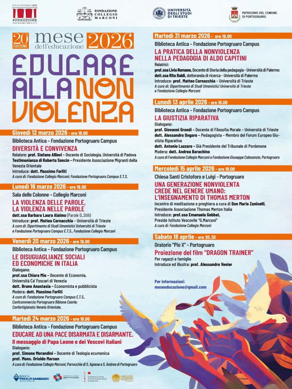Evento in collaborazione tra la Fondazione Collegio Marconi e la Fondazione Portogruaro Campus, il “MESE DELL’EDUCAZIONE 2026” nella sua 20a Edizione. Il programma prevede un ciclo di incontri, workshop e conferenze sul tema dell’educare alla non violenza rivolto a adulti (genitori, insegnanti, operatori sociali, politici) e giovani (studenti universitari e animatori)